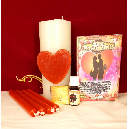 Cada Ritual - És só meu! é composto por um Velão Coração Ritualizado, "Óleo Ritualizado -És so meu", 2 selos, 4 velas vermelhas, orações e as instruções de utilização.